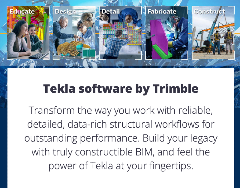 Tackling the challenges of synchronising all the functions across construction projects, Tekla's truly constructible BIM uses data-rich software and detailed workflows to meet the changing demands of your industry and customers. No matter your role or project size, Tekla can help you transform the construction industry, overcome challenges and achieve outstanding results.