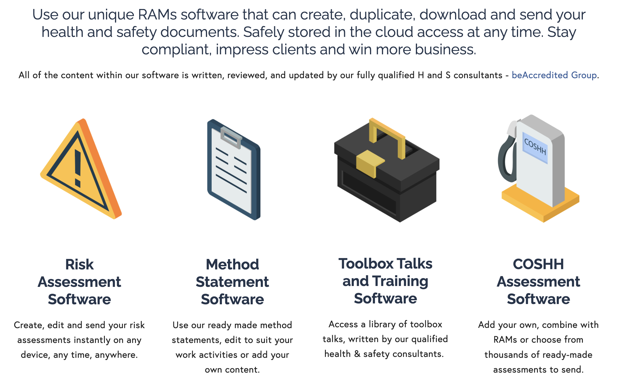 RAMs App is a Cloud-based, health and safety software, that allows you to carry out multiple tasks in one place: from risk assessment and method statements to COSHH assessments and staff training. RAMs App has a library of toolbox talks, written by qualified health & safety consultants to help you stay ahead of the game.